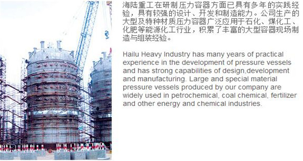 蘇州海陸重工股份有限公司位于江蘇省張家港市開發(fā)區,是國內一流的節(jié)能環(huán)保設備的專業設計制造企業,目前并已初步形成鍋爐產品、大型壓力容器、核電設備、低溫產品、環(huán)保工程共同發(fā)展的業務格局。公司創建于1956年,注冊資本51640萬元,占地面積近50萬平米。公司下設八個控股子公司,一個余熱鍋爐研究所,在瑞士、北京、武漢、南京、上海、杭州、廣州等地設立分支機構,擁有雄厚的研發(fā)實力。公司秉承“科技領航、業界先鋒”的發(fā)展理念,注重研究廢熱、余熱利用和環(huán)境保護相結合的新技術研發(fā),自主設計能力居同行前列;公司承擔過國家863計劃,江蘇省科技成果轉化專項資金,榮獲國家科技進步二等獎,產品擁有核心自主知識產權并取得專利50多項;公司推行國際先進的管理體系標準和認證,擁有 A級鍋爐制造許可證,A1、A2、A3級壓力容器設計和制造許可證,取得了民用核承壓設備制造資格許可證、美國機械工程師學會(ASME)“S”、“U”鋼印,通過了ISO9001質量體系認證、健康體系認證和14000環(huán)境體系認證;公司設備先進,裝備精良,專業嚴謹的制造理念打造出品質非凡、質量一流的“海陸”品牌聲譽。